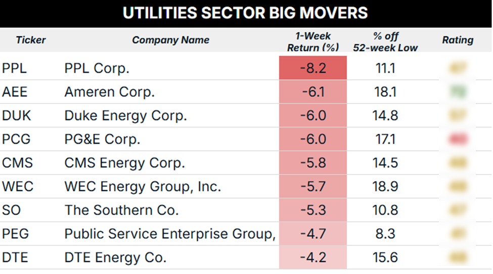 Normally, I would run a screen of the worst-performing utility stocks last week that are within 10% of their 52-week lows. Well, if I stuck to that rule, I wouldn’t have much of a list this week. Most of the worst-performing utilities this past week are still significantly above their 52-week lows due to the sector’s strong performance this year.