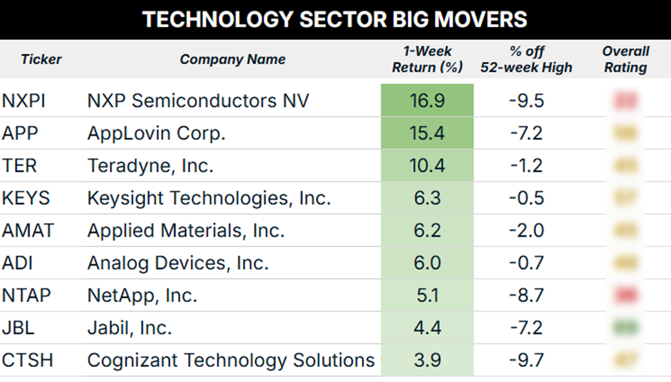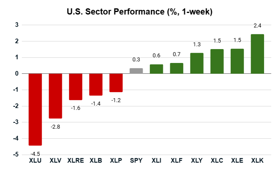 The Technology Select SPDR ETF (XLK) was the strongest performer last week, up 2.4%, following a previous week in which it was up a solid 5.2%.