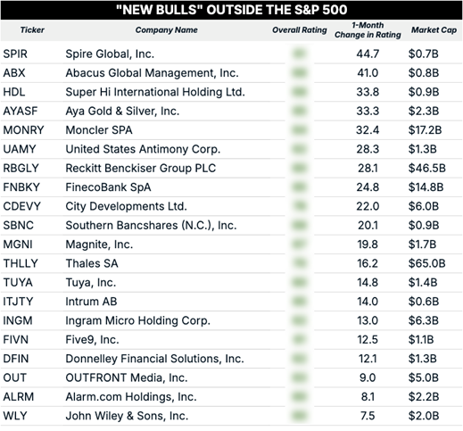 Let’s cast the net a little wider and look at the newly “Bullish” stocks outside of the S&P 500. I ran a screen for the top 20 stocks with the largest score increases over the past month, and this is what popped up: