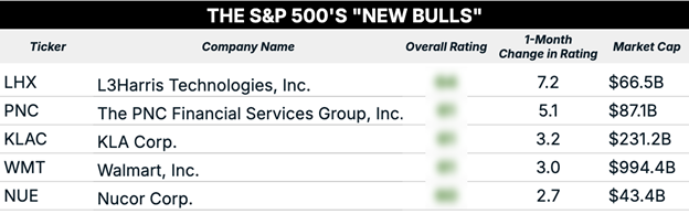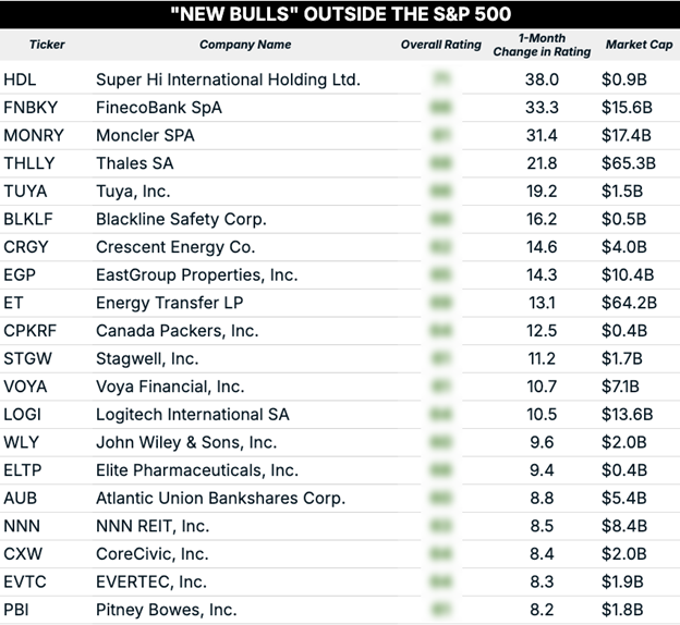 I’ll start with newly “Bullish” stocks in the S&P 500 Index, then move on to smaller and international names outside it.