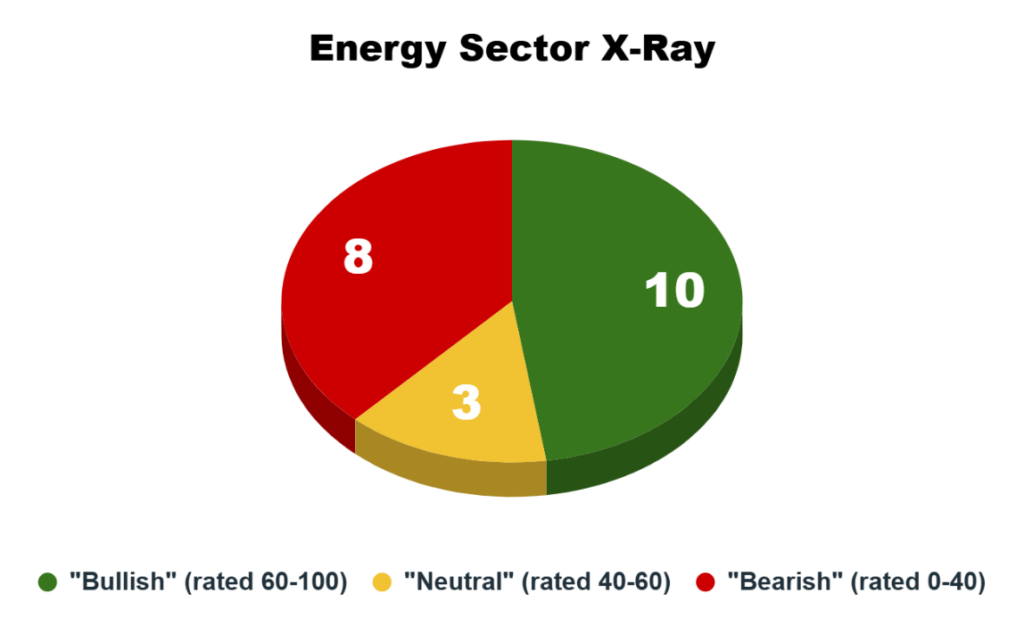 Immediately, we can see that the energy sector is a mixed bag. Of the 21 energy stocks in the S&P 500, 10 rate as “Bullish” on my Green Zone Power Ratings system and another three rate as “Neutral.” Eight rate as “Bearish.” It’s roughly evenly balanced between Bullish stocks we’d consider for further research and “meh” stocks we’d avoid.