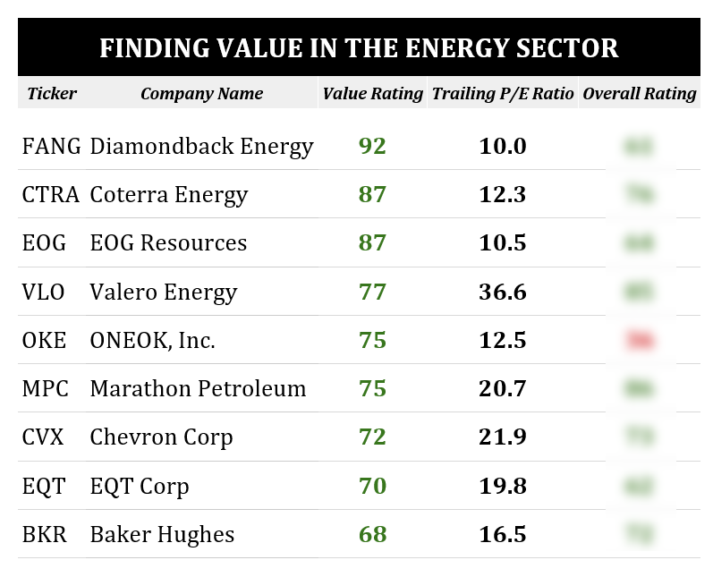 With that in mind, I ran a screen for the energy stocks that rated the highest on value. Let’s see if we can find some good candidates on the “sale rack.”