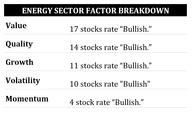 Not surprisingly, though, energy stocks tend to really score poorly on their momentum factor. Only four out of 21 rated a “Bullish” 60 or higher. Investors have been chasing tech stocks for years. There simply hasn’t been demand for energy stocks.