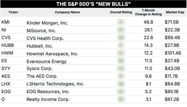 Interestingly, several companies from our neighbors up north rated particularly well this week. Financial services firm Canaccord Genuity Group (CCORF), retail REIT Primaris Real Estate Investment Trust (PMREF) and airline Air Canada (ACDVF) all enjoyed massive bumps in their ratings over the past month and now rate as “Bullish.”
