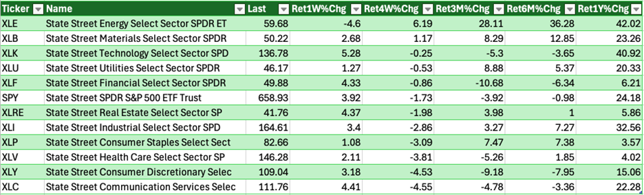 To go a step further, I used a screen to track the performance of all 11 sectors over different time periods: