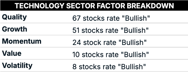 The tech sector rates highly on growth, with 51 stocks receiving a “Bullish” factor rating. But as the disclaimer on every mutual fund brochure reads, “past performance is no guarantee of future results.”