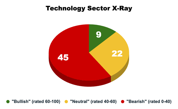 Only 9 of the 76 stocks in the rate as “Bullish,” meaning they have a score of 60 or higher. Meanwhile, 22 more rate as “Neutral.” And nearly 60%, at 45, rate as “Bearish.”