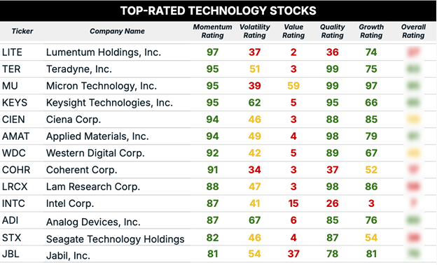I ran a screen for the tech stocks with the highest momentum scores. Every stock on this list has a “Strong Bullish” rating on momentum, meaning it has a factor score of 80 or higher. (The composite Green Zone Power Rating, blurred here, is reserved for paid subscribers to Green Zone Fortunes.)