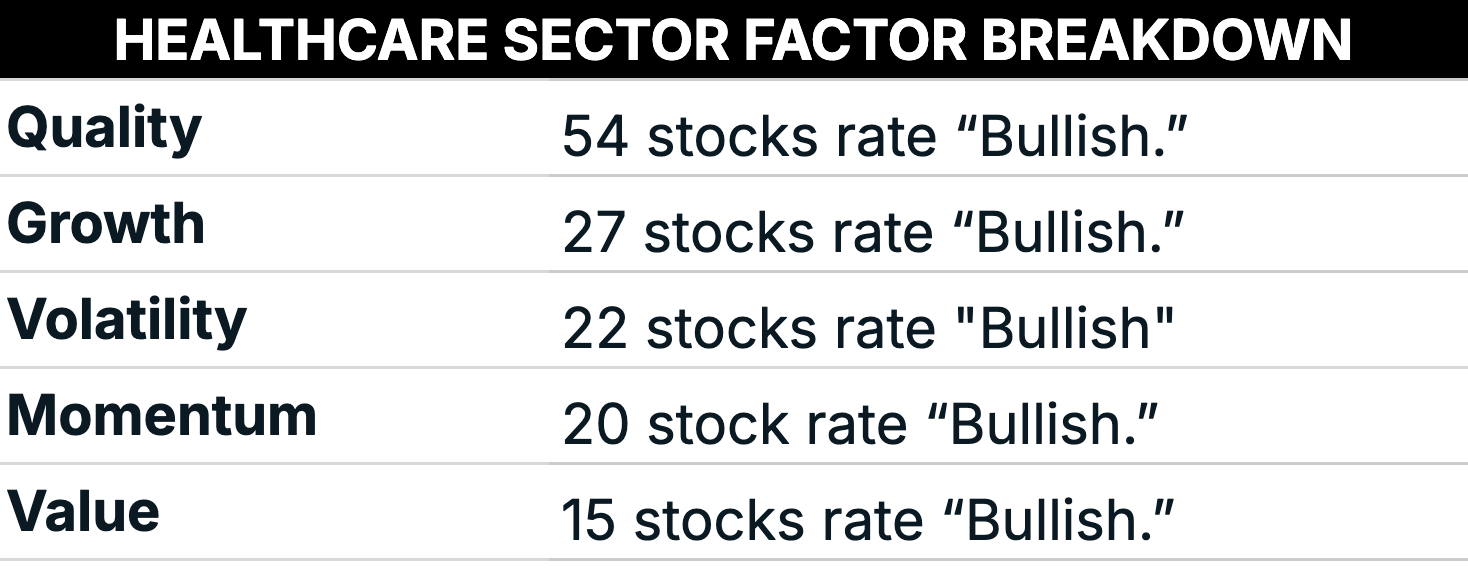 Healthcare stocks rate exceptionally well on quality today, with 54 out of 59 rating as “Bullish” on that factor.