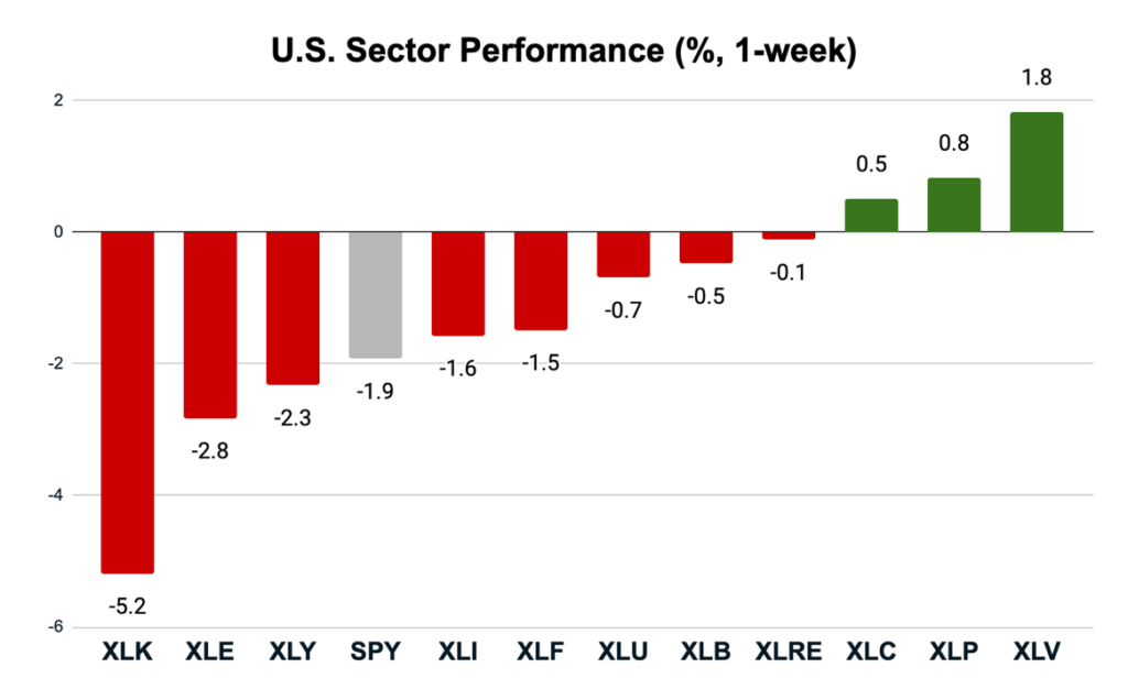 The technology sector ETF (XLK) was down 5.2% last week. Energy (XLE) and consumer discretionaries (XLY) also fell harder than the S&P 500, down 2.8% and 2.3%.