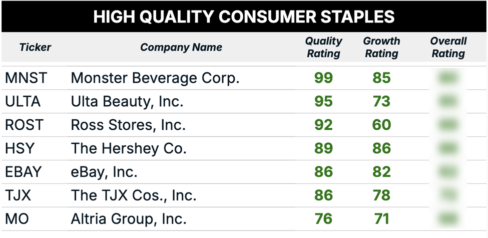 I want to focus on quality today. But I don’t want to settle on slow-growth dinosaurs. So, I compiled a list of “Bullish” rated stocks that also specifically rate as bullish on quality and growth. We’re looking for quality companies with strong brands that are growing at a healthy clip.