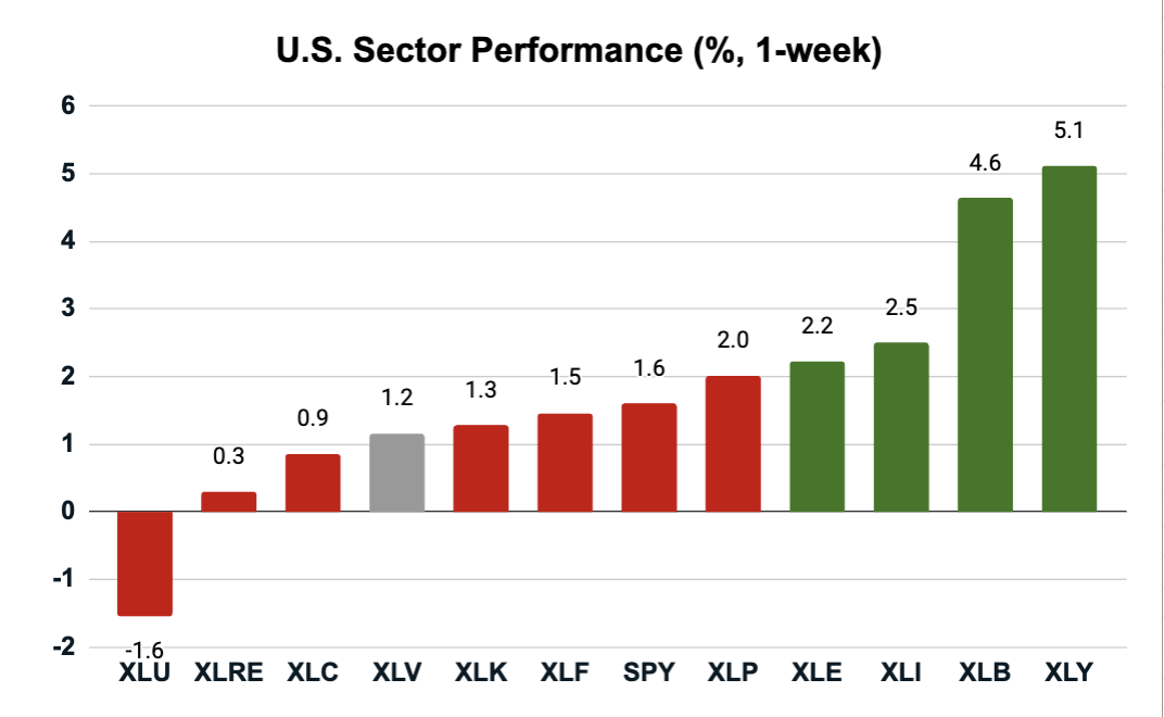 Utilities are traditionally the most conservative sector. So, a bullish week for consumer discretionaries and materials and a bearish week for utilities would fit a narrative of an optimistic Wall Street that expects growth ahead.