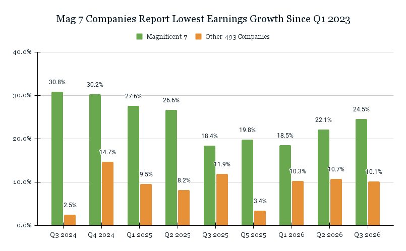 While the Magnificent 7 stocks are outpacing the other 493 stocks in the S&P 500 in terms of earnings, their Q3 earnings growth is the lowest since Q1 2023.