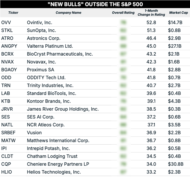 Let’s cast the net a little wider and look at the newly “Bullish” stocks outside of the S&P 500.
