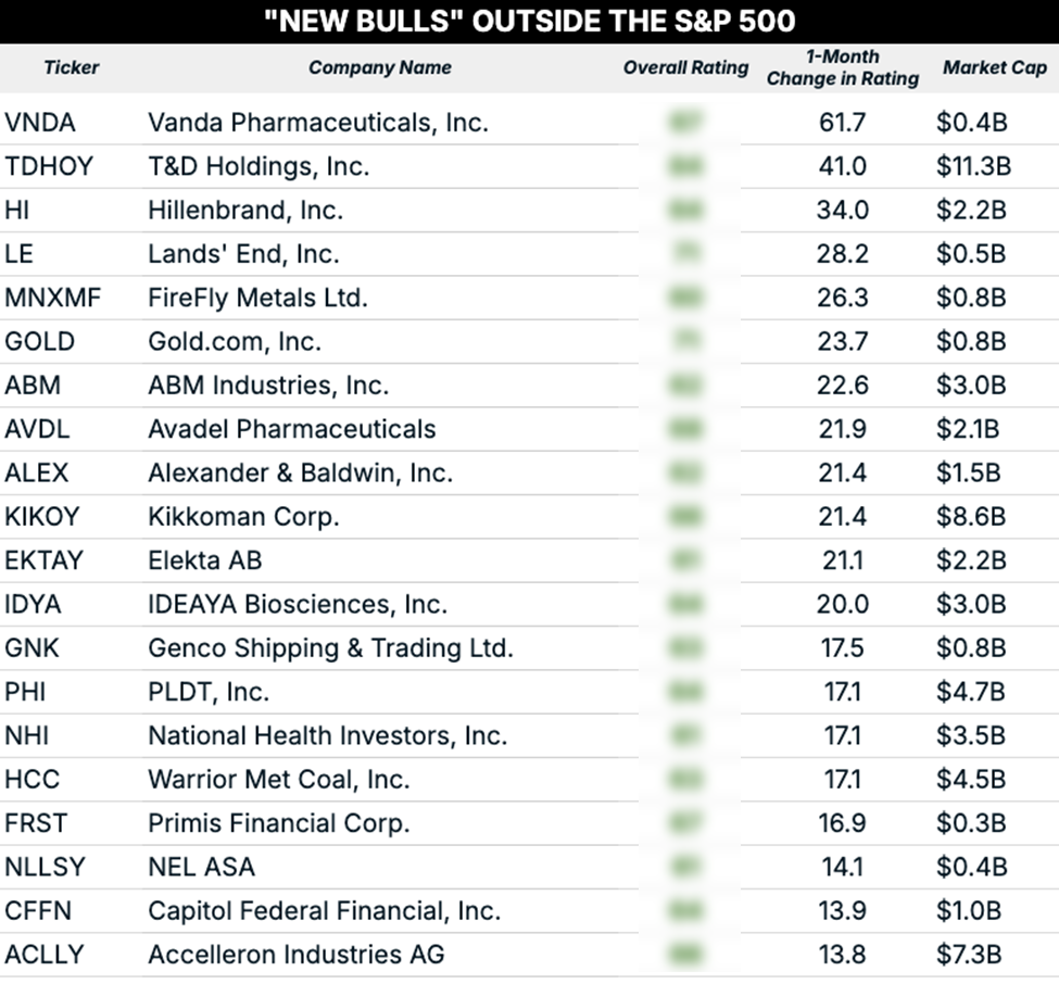 Let’s cast the net a little wider and scan the list of newly “Bullish” stocks outside the S&P 500. I screened for the top 20 this week that had the greatest one-month change in rating.