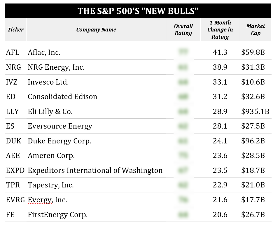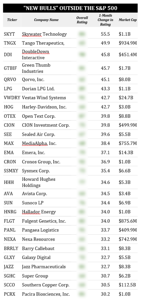 In fact, the list of new S&P 500 stocks was so long, I had to reduce it to newly “Bullish” stocks that also saw a jump of at least 20 points on their rating… and I still got 11 fresh names (none of them strictly “tech”).