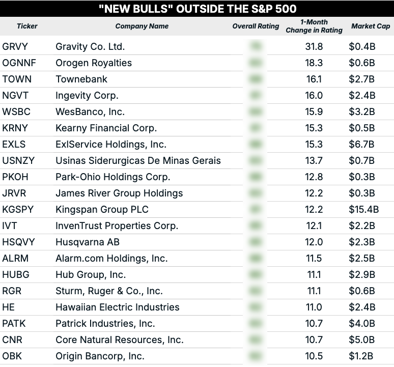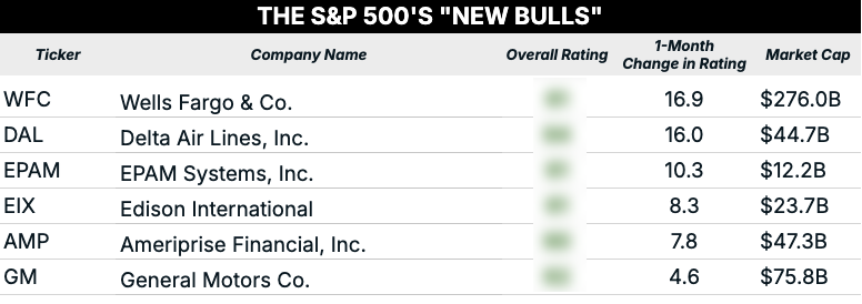 Let’s dig into the data so I can show you what I mean. We’ll start with newly “Bullish” S&P 500 stocks.
