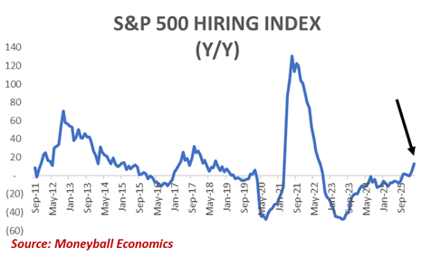 Let’s talk about businesses though. How did businesses respond to this massive shock to the economy? Massive with a lowercase M. The answer is they ignored it. They moved on. This is a chart showing year over year hiring for S&P 500 companies.