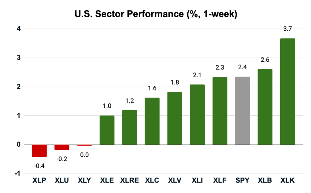 The State Street Technology Select SPDR ETF (XLK) was up 3.7%, and the State Street Materials Select SPDR ETF (XLB) was close behind at 2.6%.