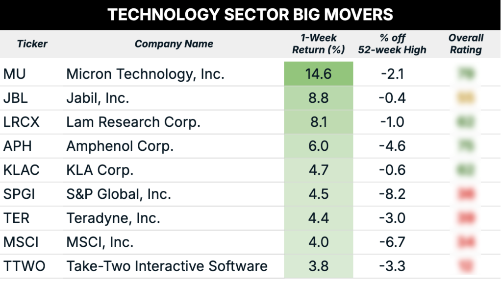 There are several big movers sporting “Bullish” Green Zone Power Ratings. Memory and storage company Micron Technology (MU) was up close to 15% last week after reporting record earnings. It’s within spitting distance of its 52-week high and it rates a very “Bullish” 79.