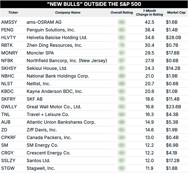 Let’s cast the net a little wider and look at the newly “Bullish” stocks outside of the S&P 500.