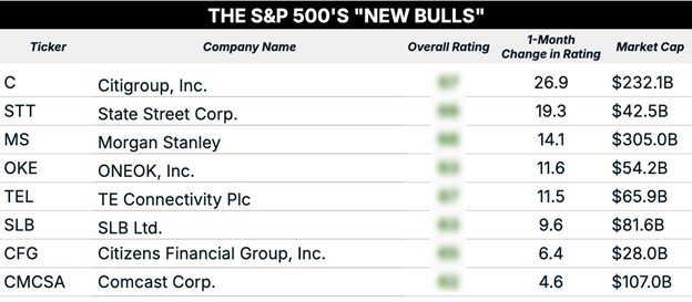 I’ll start with newly “Bullish” stocks in the S&P 500 Index, then move on to smaller and international names outside it.