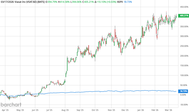 In the last 12 months, VSAT has risen 405% compared with the S&P 500 Index’s paltry 18.7% increase over the same period.