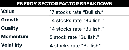 Not surprisingly, given energy’s reputation as a value sector, 17 out of 21 of the energy stocks rate as “Bullish” on their value factor.