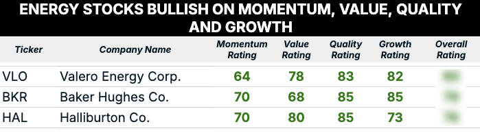 So, I did a screen of all energy stocks that rate as “Bullish” on momentum… and also bullish on value, quality and growth. I wanted a list of good companies trading at a reasonable price that have already started trending higher.
