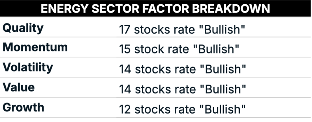 There isn’t a single dominant factor. Energy stocks are “Bullish” across all factors. (A score of 60 or greater is “Bullish.”)