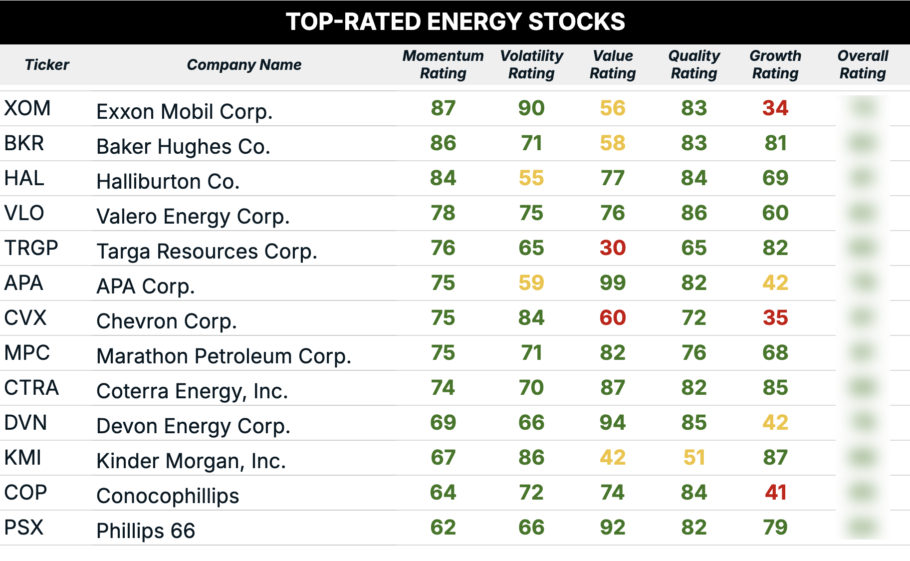 ExxonMobil (XOM) tops the list with a momentum rating of 87. You’re not getting a lot of growth in ExxonMobil – the world’s largest private-sector energy company rates a modest 34 on its growth factor.