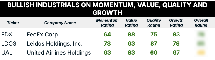 My research suggests that value stocks are poised to do well in 2026. So, let’s drill down into those elite few that rate highly on value. I ran a screen of industrial stocks that rate as “Bullish” on value, momentum, quality and growth. We’re looking for high-quality growth stocks that are trending higher… and still trading at a reasonable price.