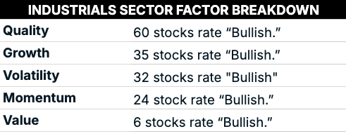 Now, if there is one factor where industrials really tend to lose points, it would be value. It seems the sector as a whole isn’t particularly cheap, with only six industrials currently rated as “Bullish” on value.