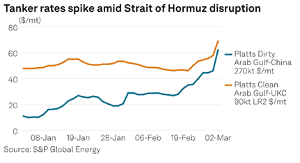 With Iran essentially closing the Strait of Hormuz, shipping companies in the region now have to assess different, longer routes… passing those costs on to oil and gas companies.
