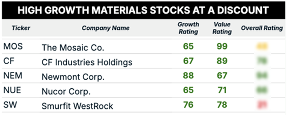 So, let’s dig even deeper into the sector. I ran a screen for all materials stocks that rate as “Bullish” on both their growth and value factors.