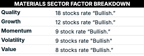 The stocks in the materials sector score well on my quality factor, with 18 out of the 32 rated as “Bullish” on the factor. (Ratings of 60 or higher are “Bullish.”)