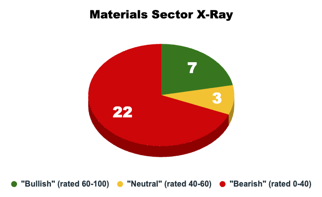 As a whole, the materials sector does not rate well on my Green Zone Power Ratings system. Of the 32 stocks in the sector, 22 rate as “Bearish” and another three rate as “Neutral.” Only seven rate as “Bullish.”
