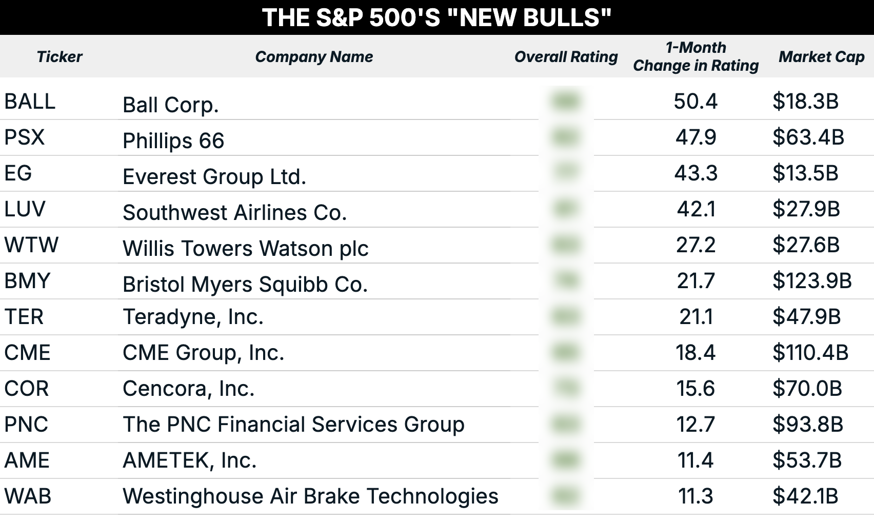 Speaking of systems, let’s see what companies have recently popped up as “Bullish” on my Green Zone Power Ratings system, starting with the newly “Bullish” members of the S&P 500.