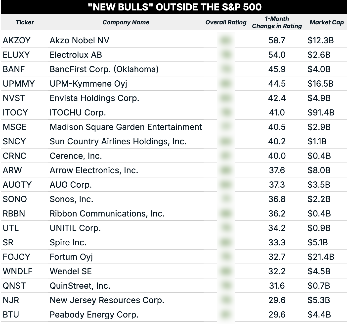 Let’s cast the net a little wider and look at the newly “Bullish” stocks outside of the S&P 500 Index. I ran a screen for the top 20 stocks that saw the greatest jump in their score over the past month.