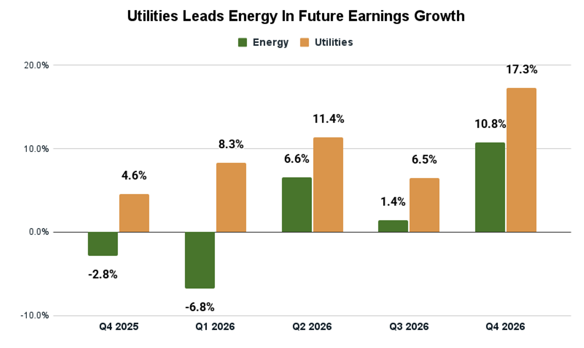 By Q4 2026, the utilities sector is expected to increase EPS by 17.3% year over year. In fact, the utilities sector of the market is expected to deliver double-digit earnings growth over the next two quarters.